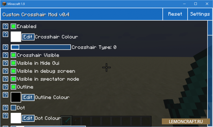 Мод на настраиваемый прицел Custom Crosshair добавляет в игр возможность изменить внешний вид прицела, настроив его полностью под свои нужды. Вы сможете настроить форму прицела, его размер и цвет. Для вызова меню настроек нажмите: Ё она же ~ ( либо C в новых версиях)