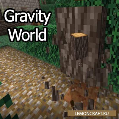 Мод на гравитацию GravityWorld добавляет в игру понятие гравитации, если вы срубили дерево то блоки упаду, листва так же осыплется, если вы копаете ямку, грязь будет осыпаться.